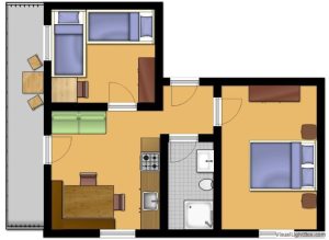 Ferienwohnung für 2-4 Personen, 2 Schlafzimmern, 43 m2 + 7,9m2 Balkon